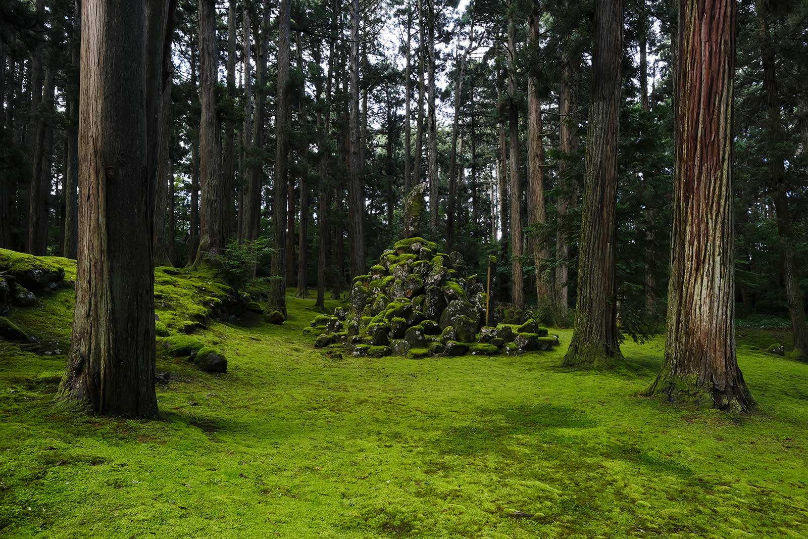 一礼して一の鳥居をくぐった先は、奥の方まで真っすぐに伸びた参道に、空と地を緑で覆うように両側を背の高い杉木立と苔が参道に沿ってずっと続いており、この光景には思わず見入ってしまいます。